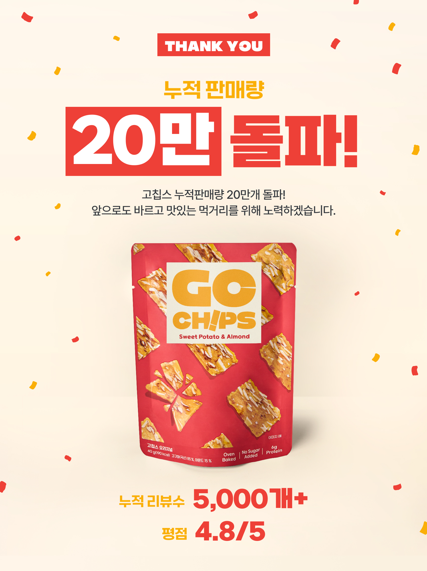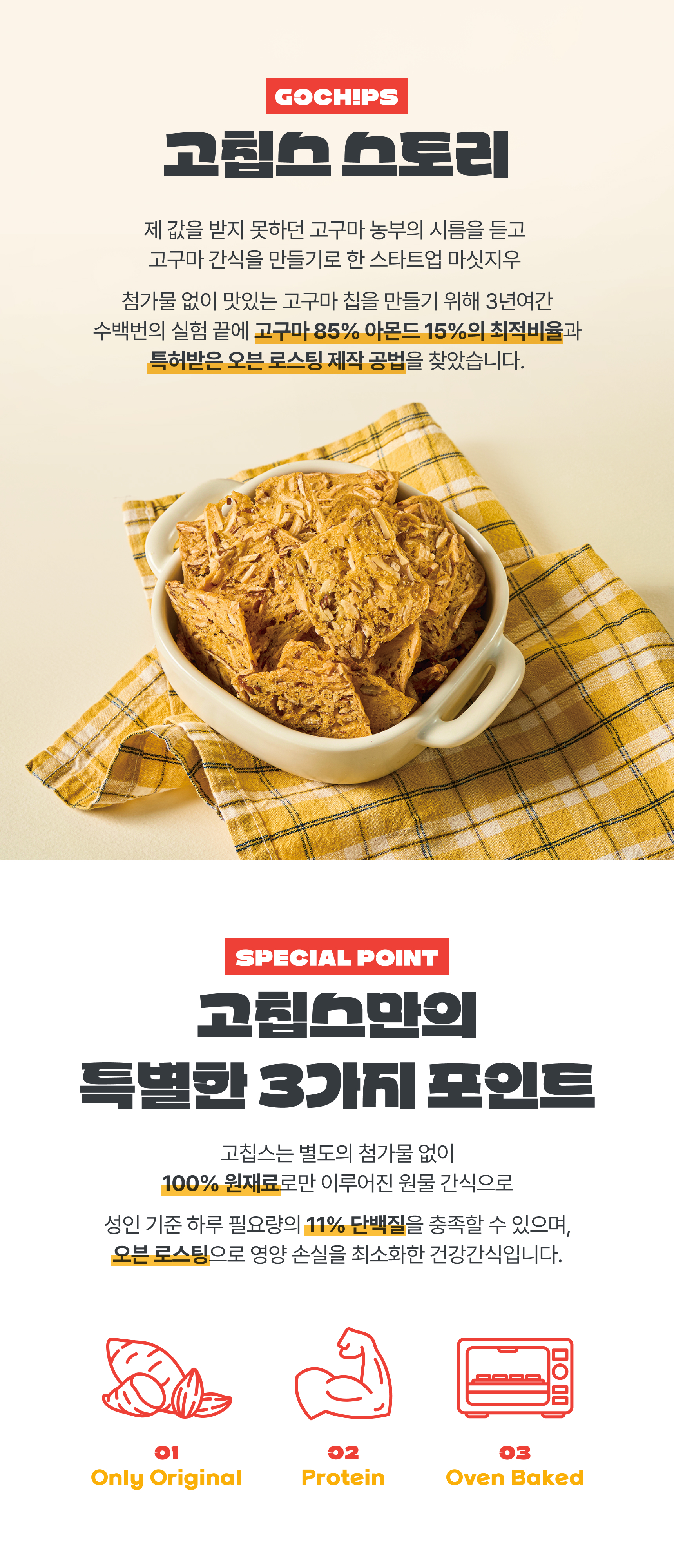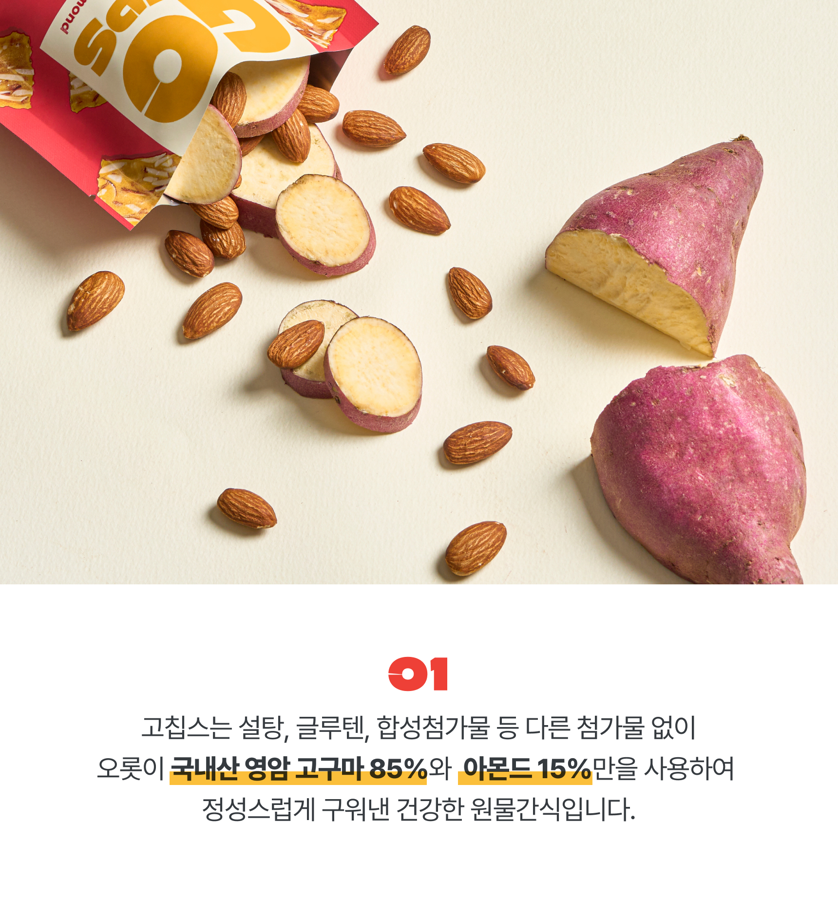 고구마와 아몬드로 만든 고칩스! 오븐에 구워 영양은 높이고 칼로리는 낮췄습니다. 단백질 6g, 무설탕으로 건강한 맛을 즐기세요. 언제 어디서나 간편하게 즐기는 영양 간식!