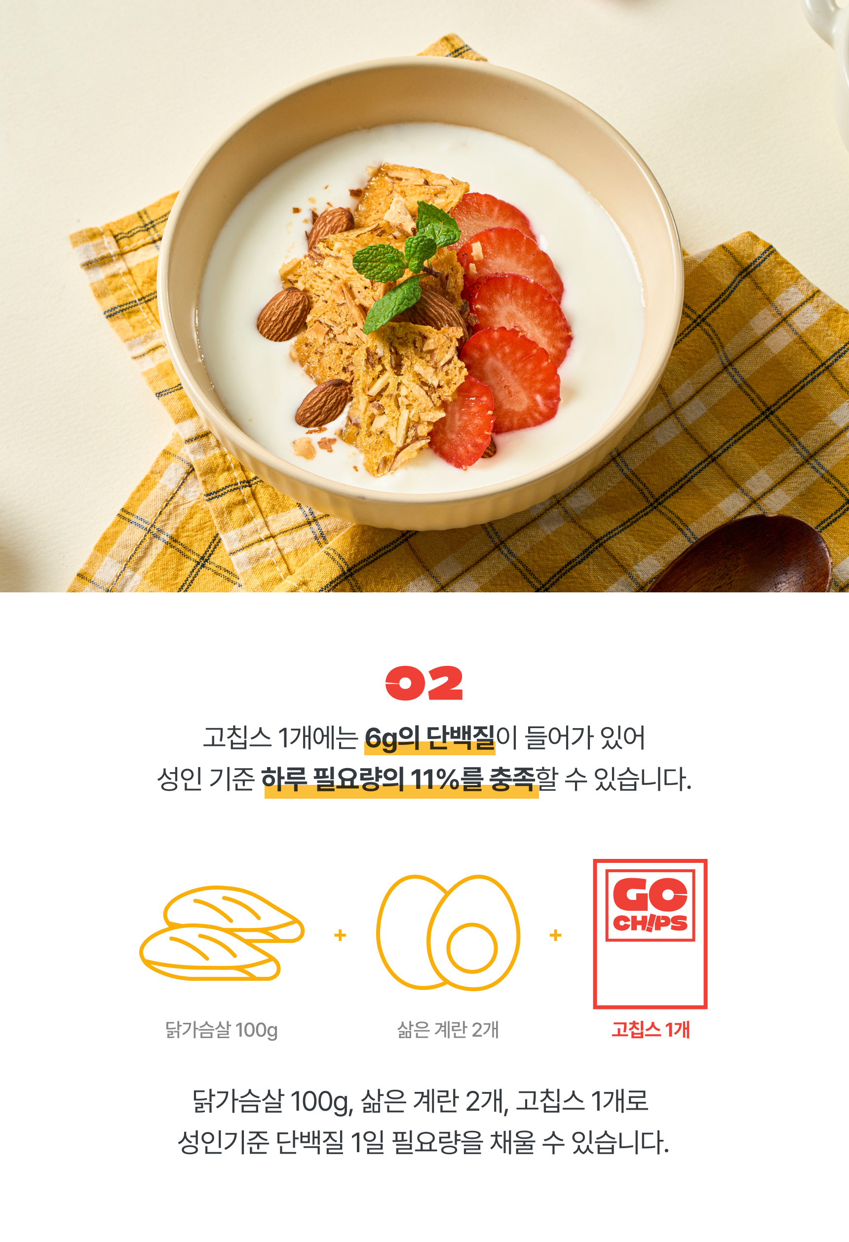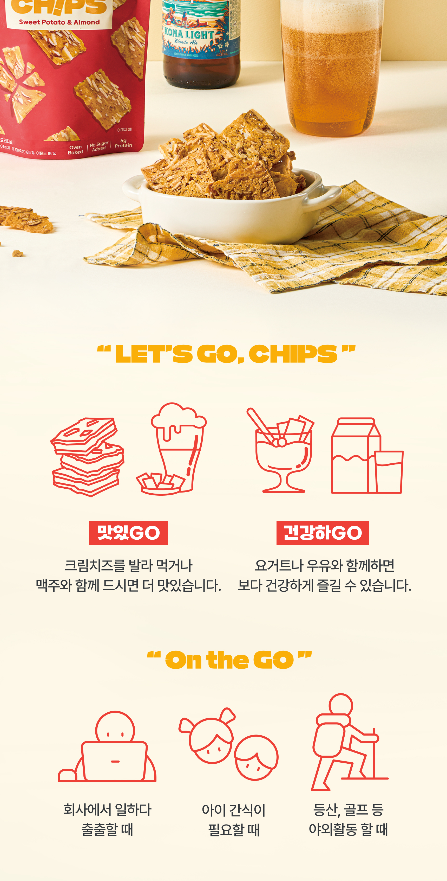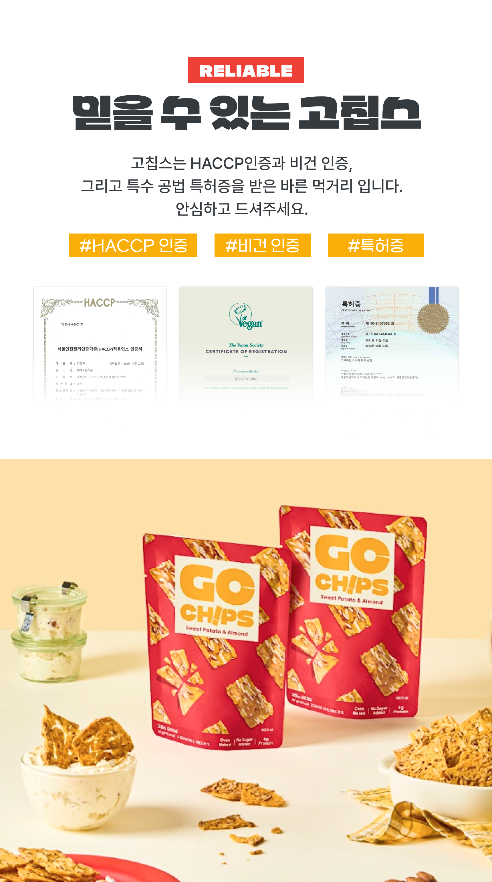 고구마와 아몬드로 만든 고칩스! 오븐에 구워 영양은 높이고 칼로리는 낮췄습니다. 단백질 6g, 무설탕으로 건강한 맛을 즐기세요. 언제 어디서나 간편하게 즐기는 영양 간식!