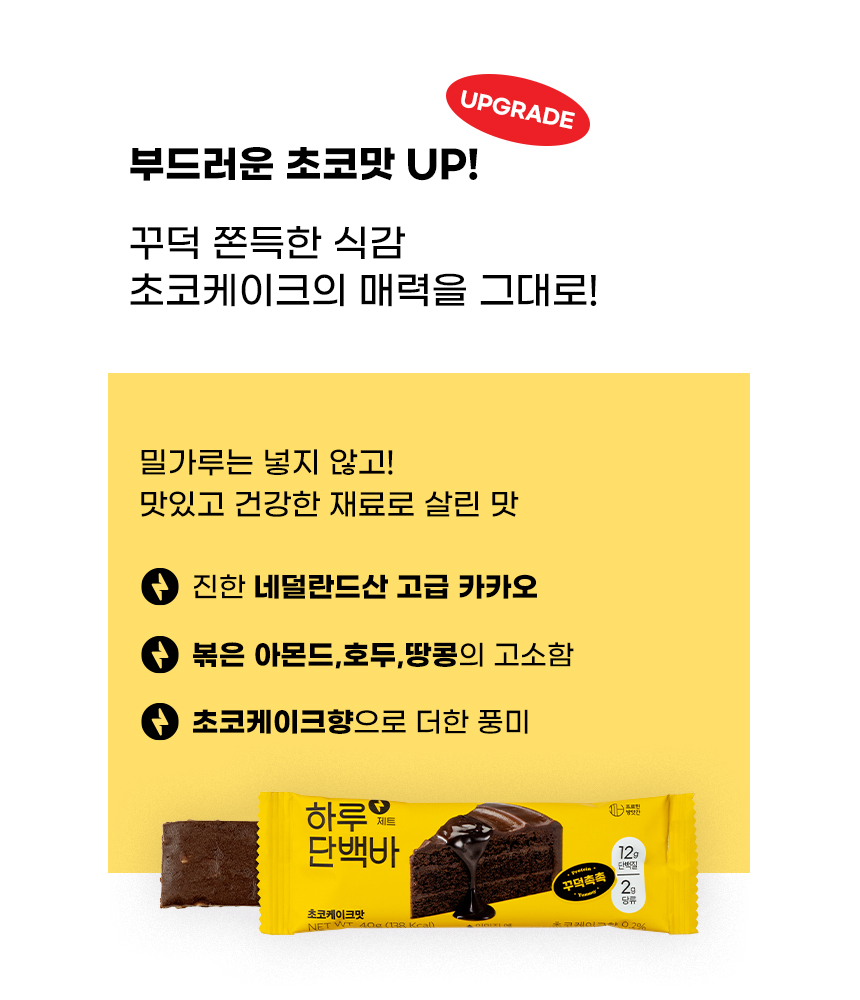 단백질 간식의 새로운 기준! 🍫✨ 하루단백바 제트로 맛있게 식단관리하세요. 꾸덕꾸덕한 식감과 오도독 씹히는 견과류의 조화로 디저트 같은 맛을 즐기면서도 건강을 챙길 수 있어요. MZ세대 운동러버들의 필수품으로 자리잡은 비결, 바로 맛과 영양의 완벽한 밸런스! 평점 4.7점의 인기 비결을 직접 경험해보세요.