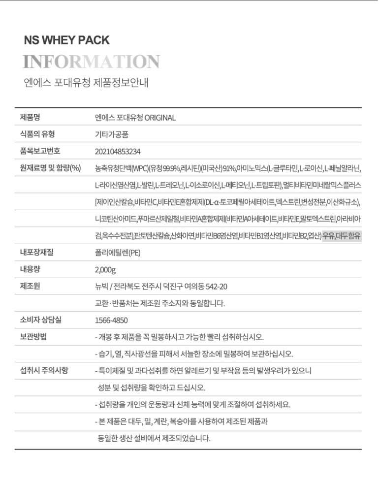 NS포대유청 WPC 오리지널 2kg 기본영양성분