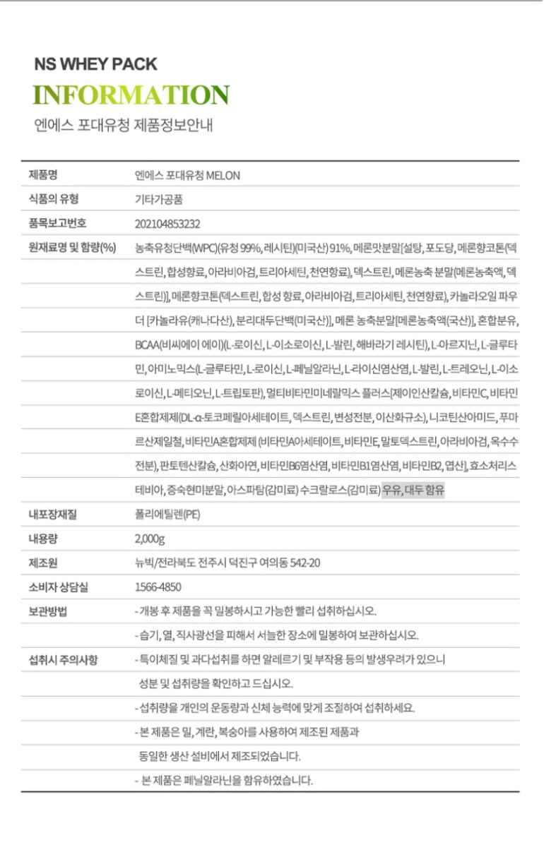 NS포대유청 WPC 메론 2kg 기본영양성분